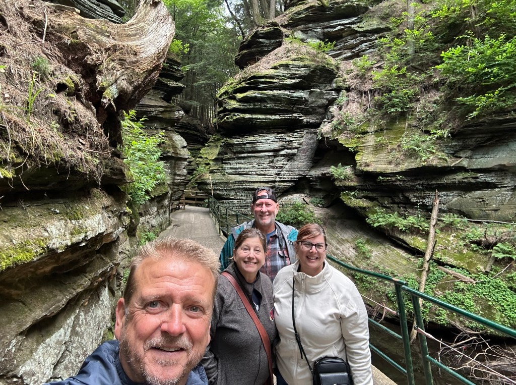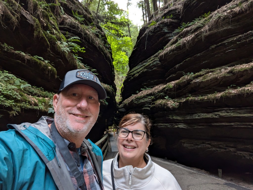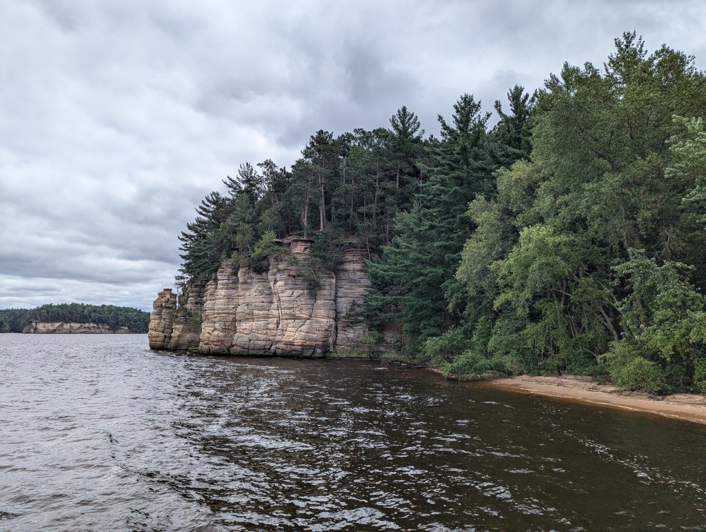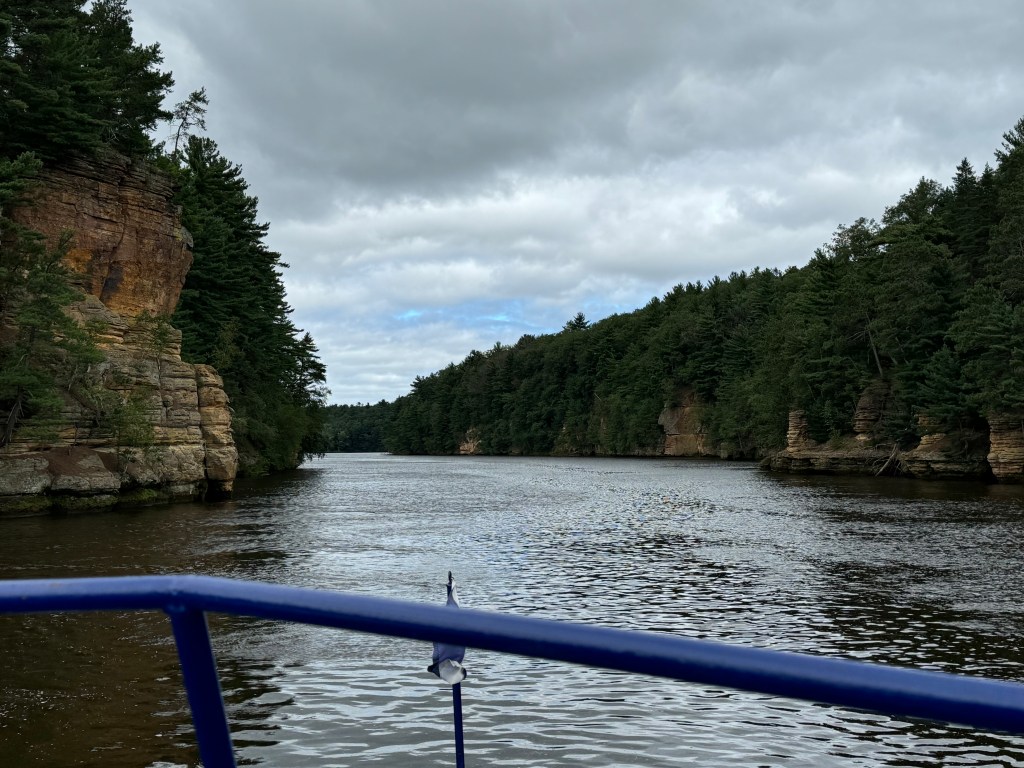 We followed that up with a boat tour of the Upper Dells. The tour travels the Wisconsin River above the dam in Wisconsin Dells. You’ll cruise a channel cut by ancient glaciers, passing under pine-crowned cliffs, through the Narrows and past iconic sandstone formations. Making two shore landings: Witches Gulch — similar to Antelope Canyon as it’s in a sandstone canyon carved by water only it’s in a forest setting, and Stand Rock — a towering pillar of sandstone that’s home to the famous dog leap to the top of the tall rock.
