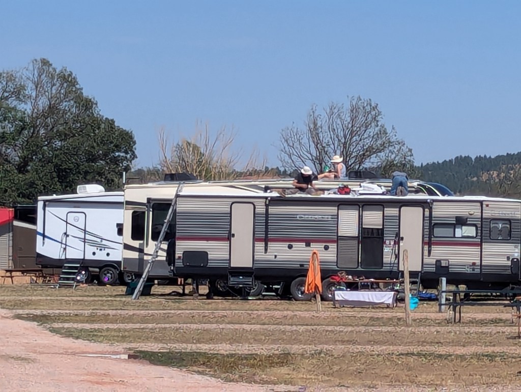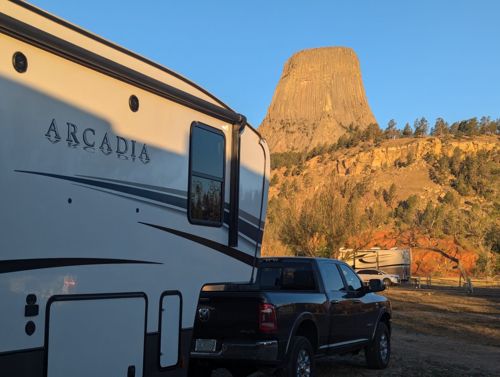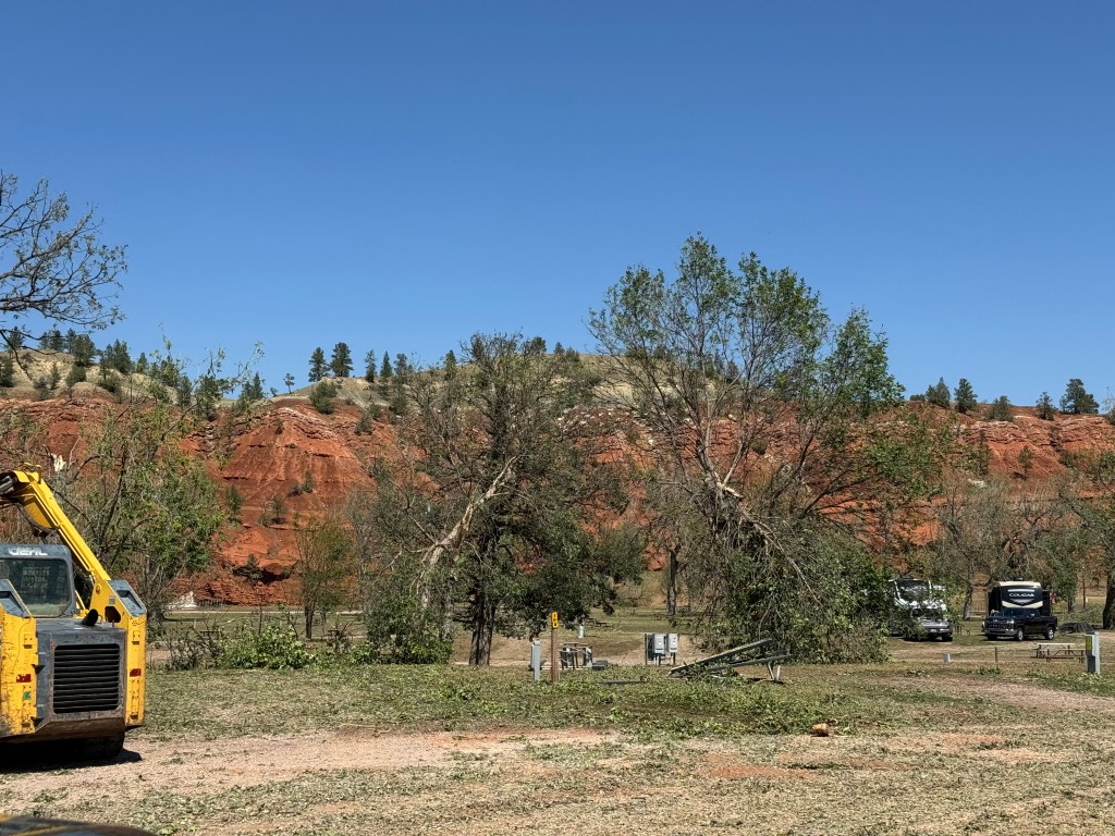 The final stop for our Black Hills tour was at Devils Tower. We arrived for our stay at the Devils Tower KOA to find that they had experienced a microburst the night before which included 100 mph winds and golf ball sized hail. It must have been a horrible to experience. Trees stripped of leaves and or uprooted, skylights smashed, windshields broken, motorhomes and tow vehicles dented. The KOA staff was everywhere cleaning up but we were able to stay even though Devils Tower was closed to visitors.