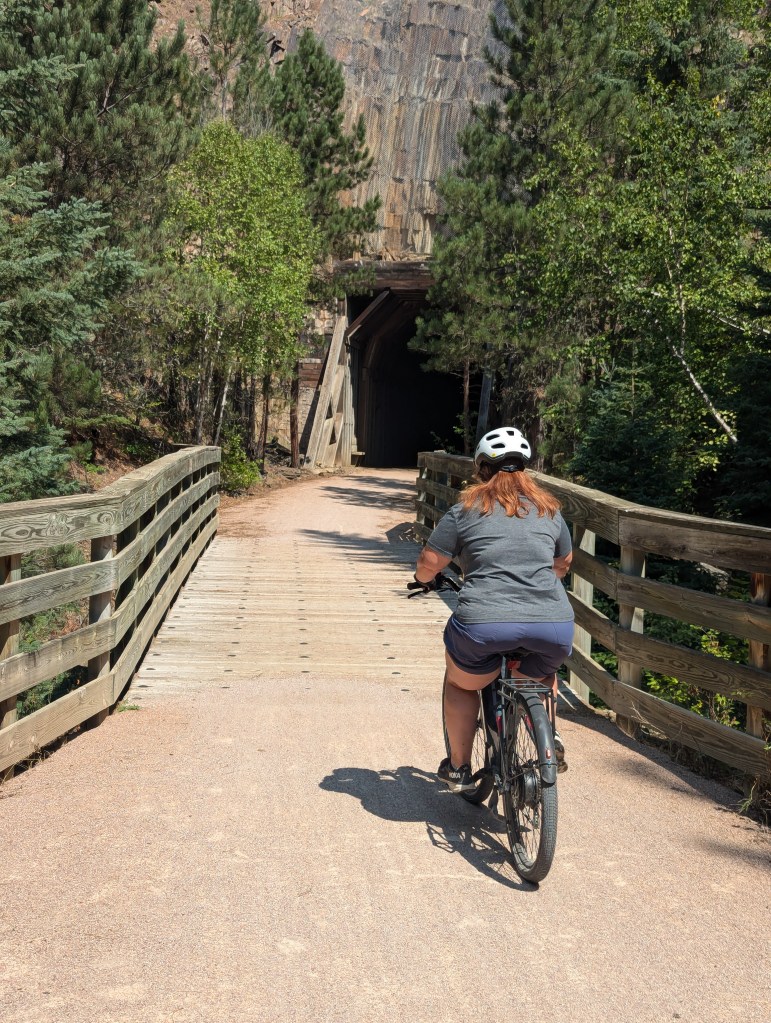 Another gem we were lucky enough to find was the George S. Mickelson Rail Trail which runs 109 miles through much of the Black Hills. From Deadwood, all the way down to Edgemont. We chose to enter the trail at Mystic Station which allowed us to ride our bikes along the trail for about 15 miles including several trussell bridges and three tunnels. Fantastic!!
